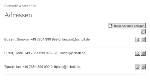 Ok, das Ganze sieht noch nicht so aus, wie ich es will. Die Überschrift „Listenseite“ der Anwendung ändere ich über die Seitenbearbeitung in „Adressen“ und den Button „Neue Datei anlegen“ in „Neue Adresse anlegen“. 15 Sekunden. Das war einfach.