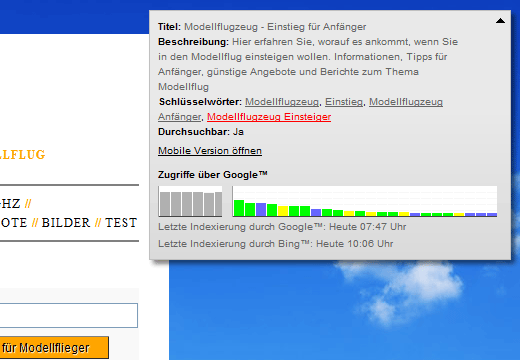 Über die farbigen Balken werden aufgrund der darstellbaren Breite nicht alle Suchbegriffe, sondern nur die mit den meisten Zugriffen angezeigt. Die Summen der Klicks auf die grauen Balken und die Summe der Klicks aus den farbigen Balken stimmt überein, wenn in einem Monat auf eine Seite über weniger als 25 Suchbegriffeüber Google zugegriffen wurde.